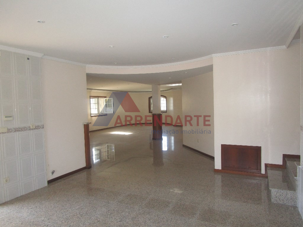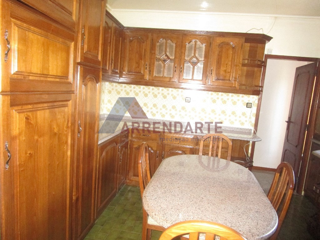 COZINHA MOBILADA, LAREIRA, CAIXILHARIA EM ALUMINIO COM VIDROS DUPLOE E PORTADAS LACADAS EM ALUMINIO.